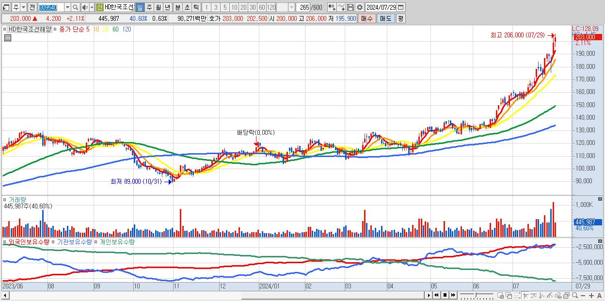 - HD한국조선해양 (203,000원 ▲ 2.11% , 시총: 143,669억, 거래량: 446,072, 거래대금:903억, KOSPI)