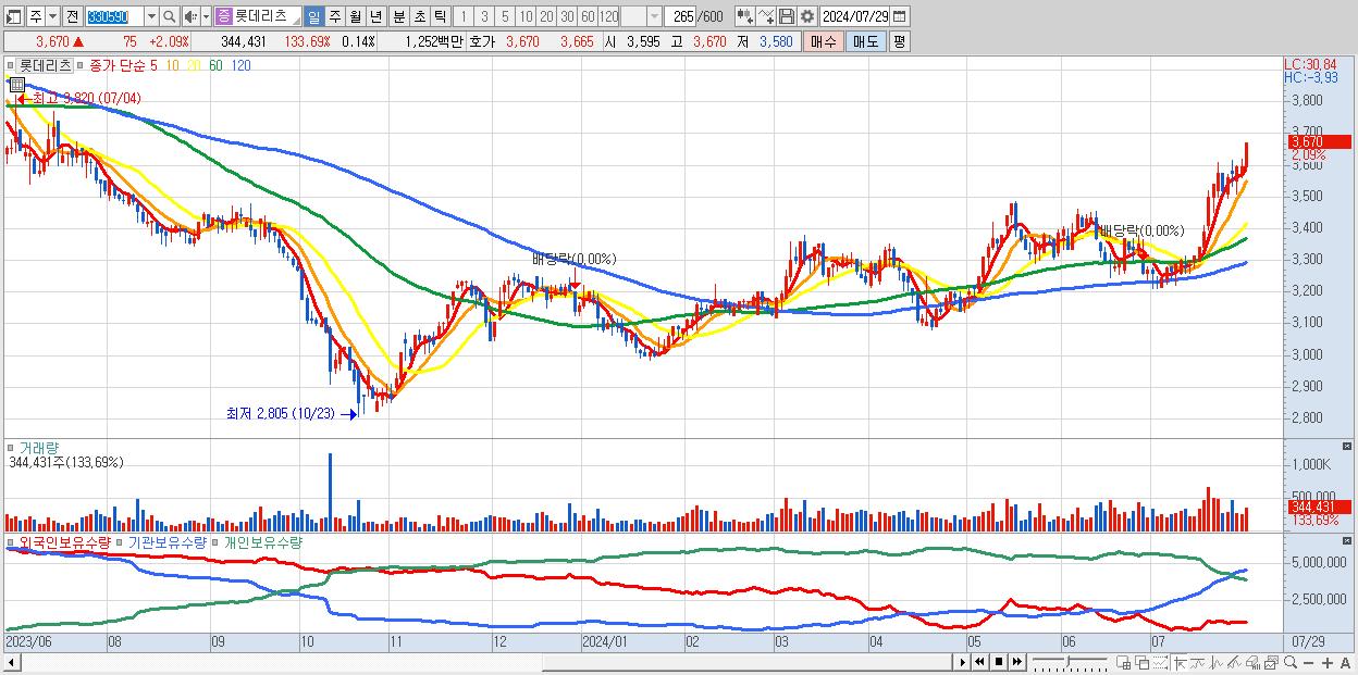 - 롯데리츠 (3,670원 ▲ 2.09% , 시총: 8,917억, 거래량: 344,437, 거래대금:13억, KOSPI)
