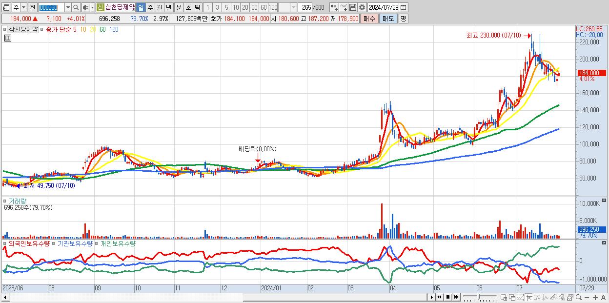 - 삼천당제약 (184,000원 ▲ 4.01% , 시총: 43,162억, 거래량: 696,258, 거래대금:1,278억)