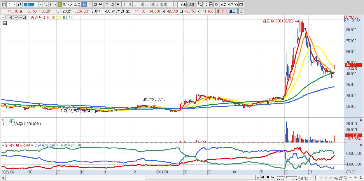 - 한국가스공사 (44,100원 ▲ 13.22% , 시총: 40,710억, 거래량: 11,112,624, 거래대금:4,884억)