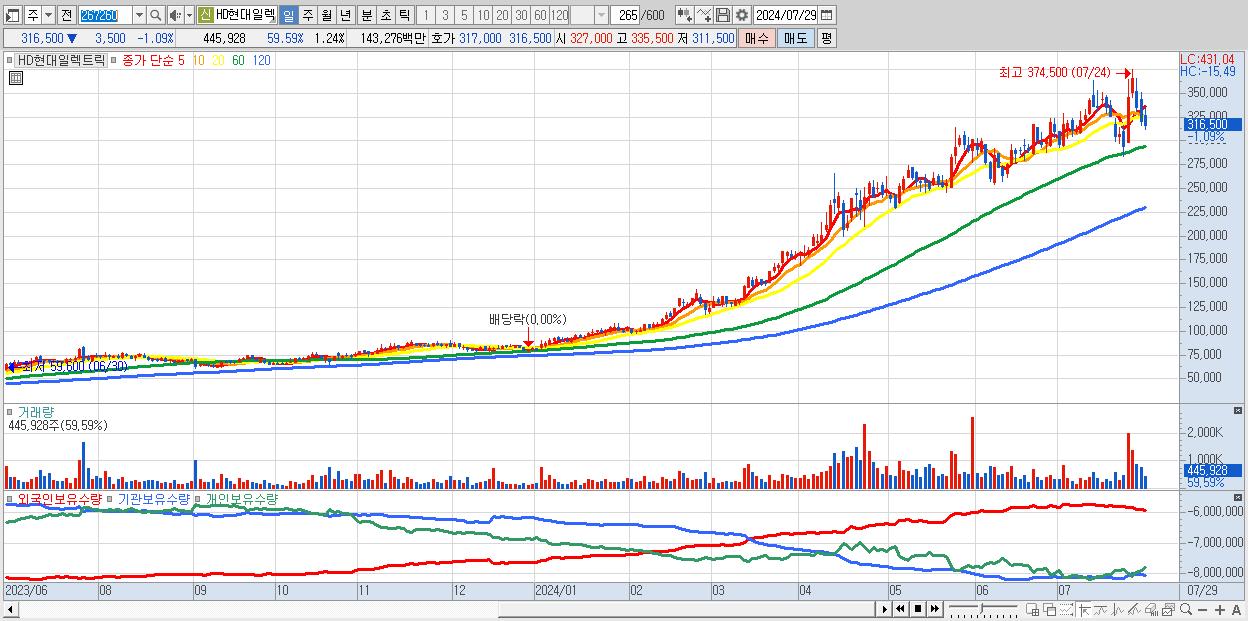 - HD현대일렉트릭 (316,500원 ▼ -1.09% , 시총: 114,089억, 거래량: 445,928, 거래대금:1,433억)