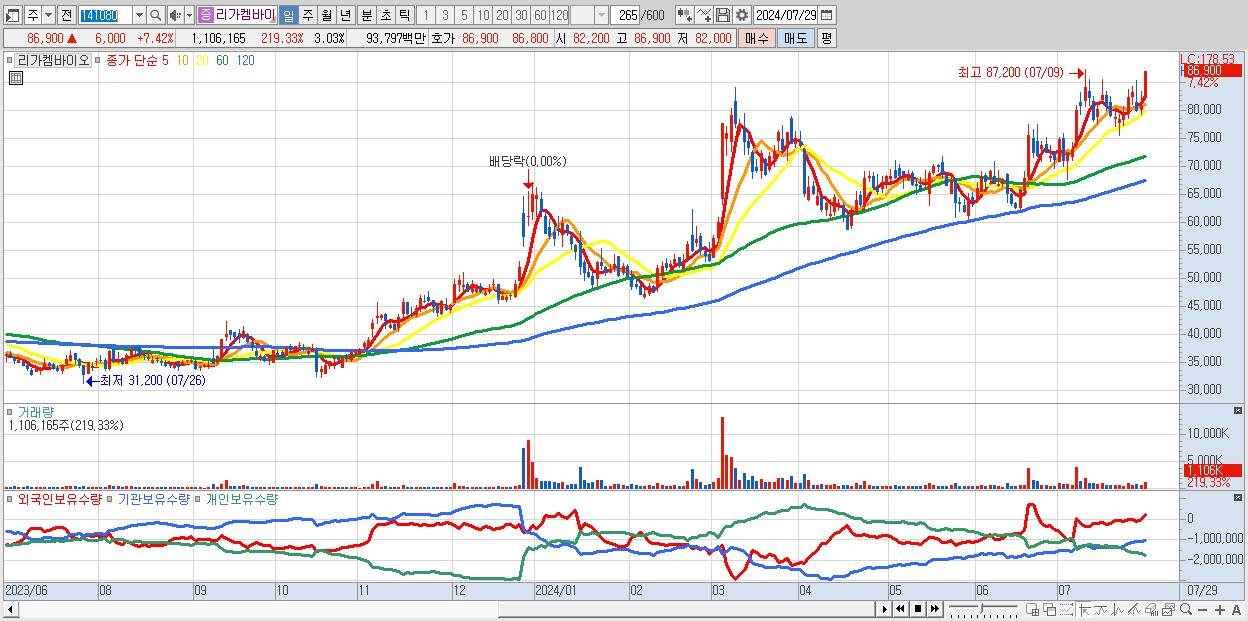 - 리가켐바이오 (86,900원 ▲ 7.42% , 시총: 31,777억, 거래량: 1,106,165, 거래대금:938억)