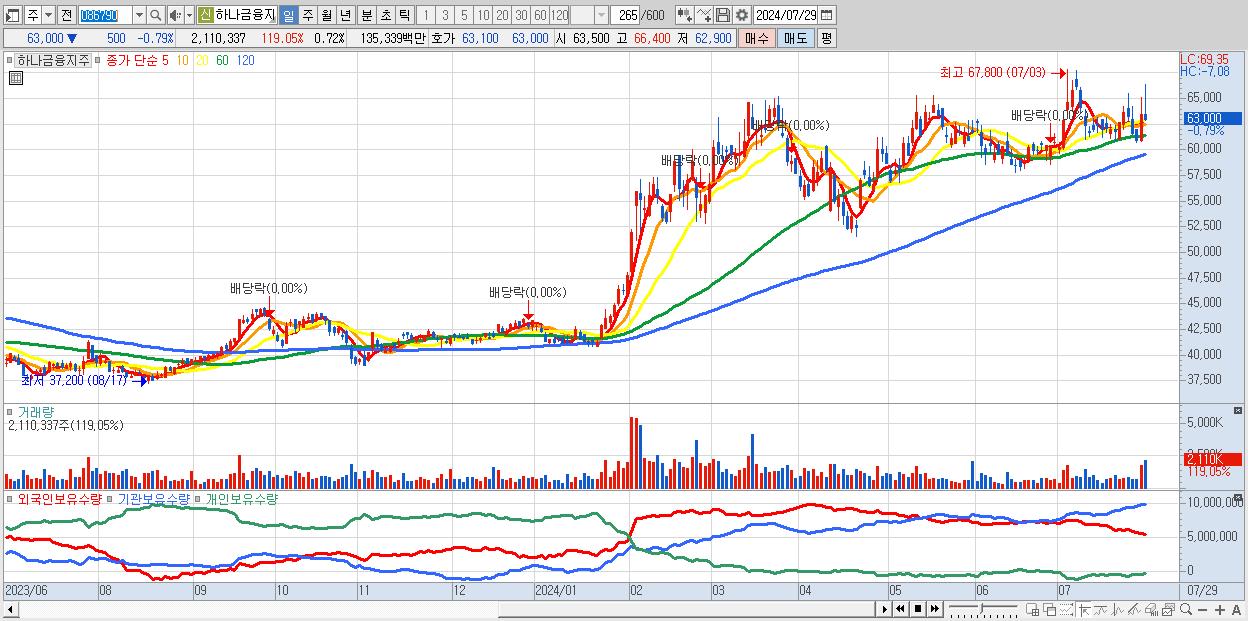 - 하나금융지주 (63,000원 ▼ -0.79% , 시총: 184,185억, 거래량: 2,110,337, 거래대금:1,353억)