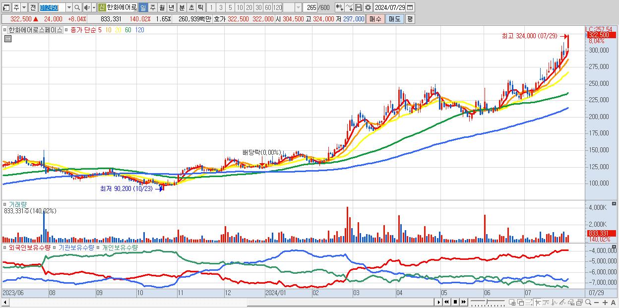 - 한화에어로스페이스 (322,500원 ▲ 8.04% , 시총: 163,282억, 거래량: 833,331, 거래대금:2,609억)
