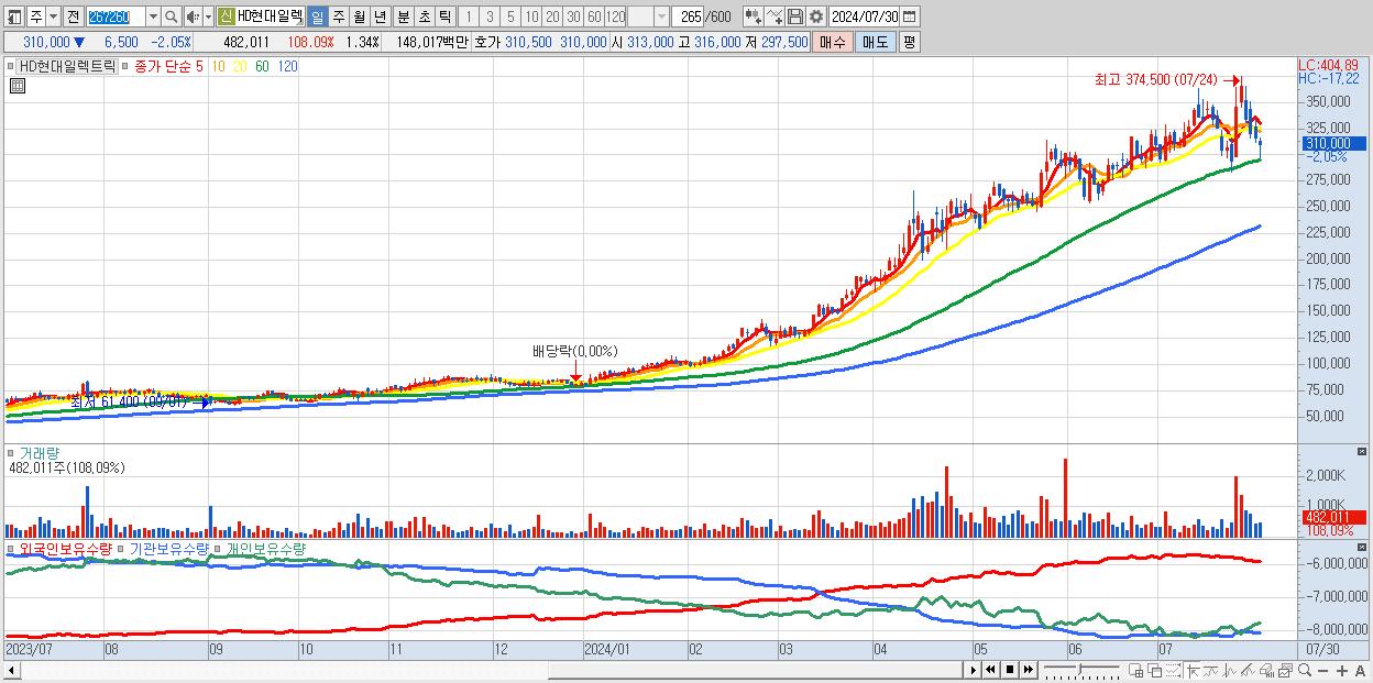 - HD현대일렉트릭 (310,000원 ▼ -2.05% , 시총: 111,746억, 거래량: 482,011, 거래대금:1,480억)