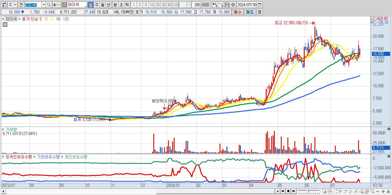 - 와이씨 (16,500원 ▼ -9.64% , 시총: 13,537억, 거래량: 8,711,031, 거래대금:1,461억)
