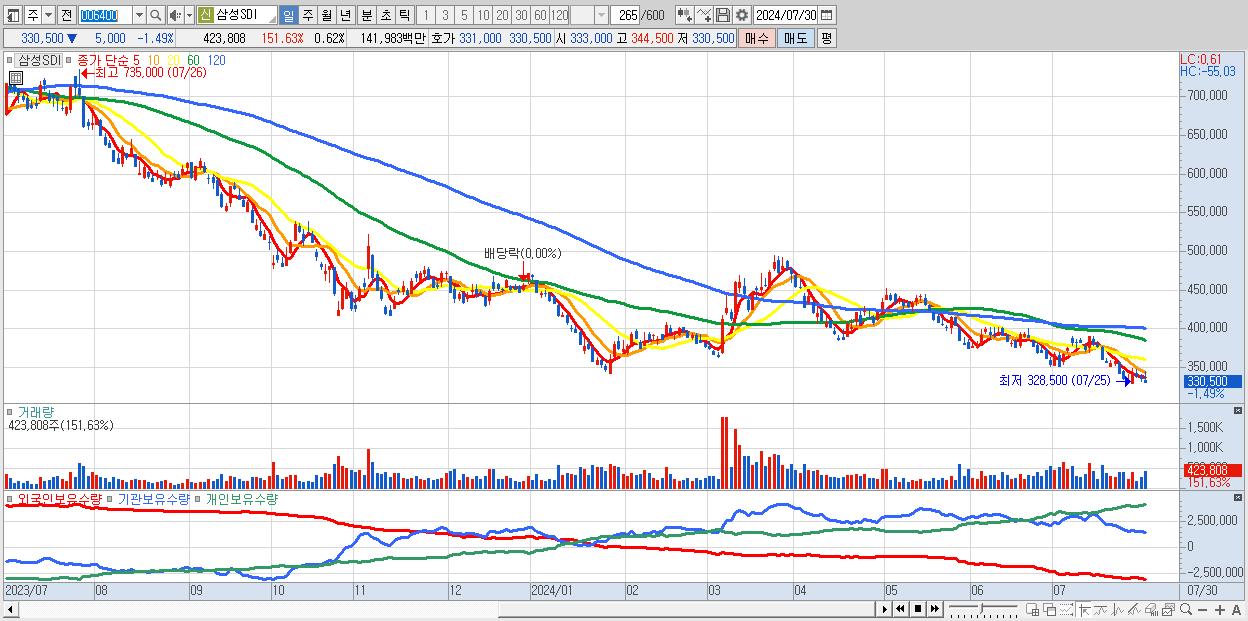 - 삼성SDI (330,500원 ▼ -1.49% , 시총: 227,267억, 거래량: 423,808, 거래대금:1,420억)