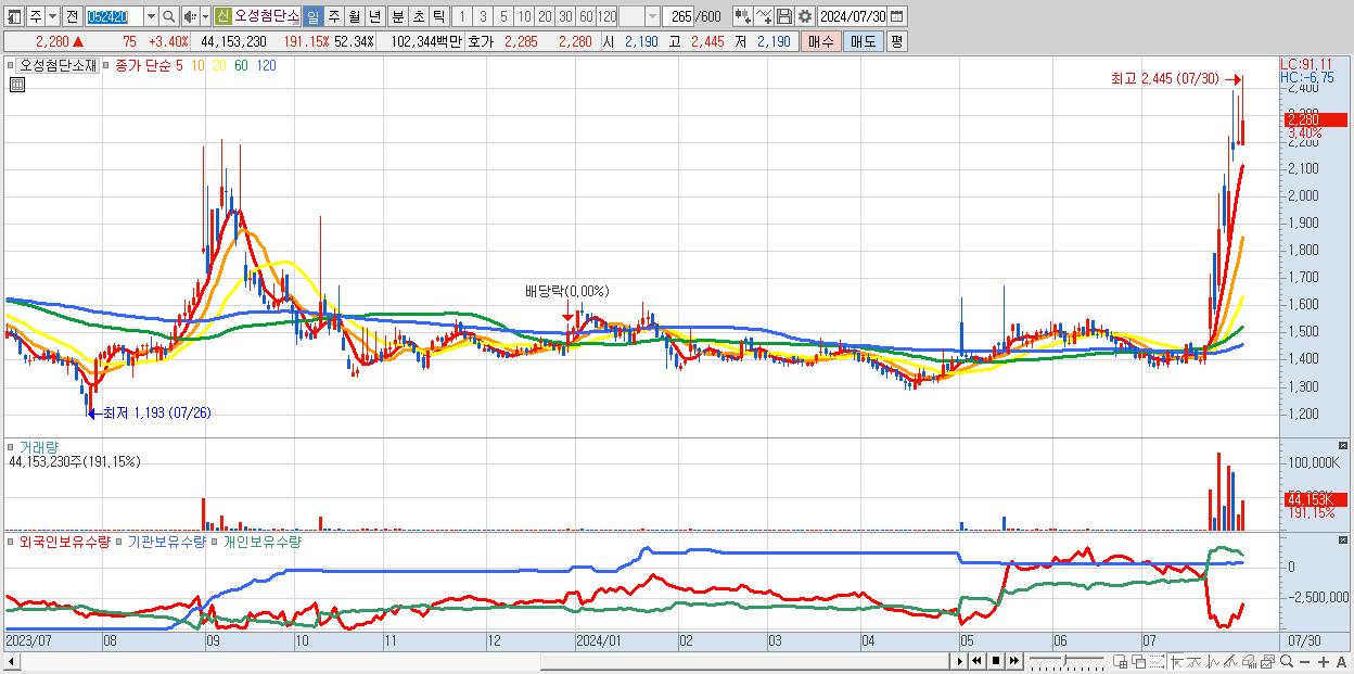 - 오성첨단소재 (2,280원 ▲ 3.4% , 시총: 1,923억, 거래량: 44,153,230, 거래대금:1,023억)