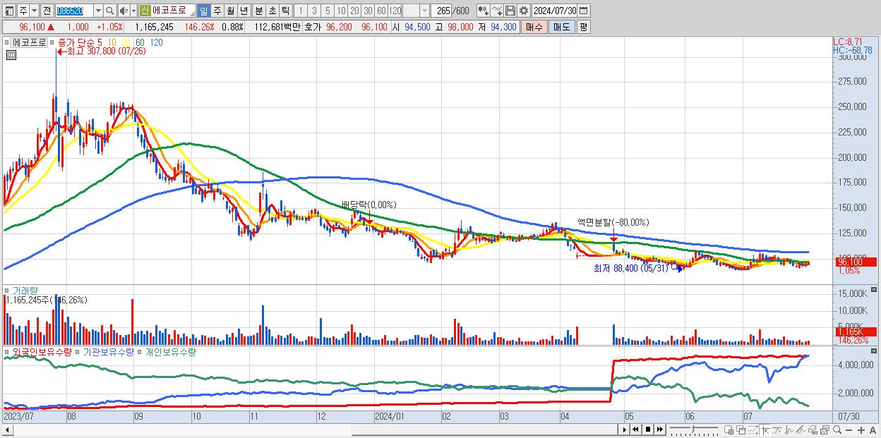 - 에코프로 (96,100원 ▲ 1.05% , 시총: 127,946억, 거래량: 1,165,245, 거래대금:1,127억)