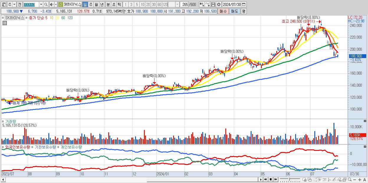 - SK하이닉스 (188,900원 ▼ -3.43% , 시총: 1,375,196억, 거래량: 5,165,131, 거래대금:9,731억)