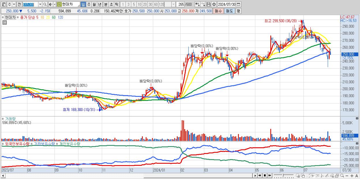 - 현대차 (250,000원 ▼ -2.15% , 시총: 523,540억, 거래량: 594,899, 거래대금:1,505억)