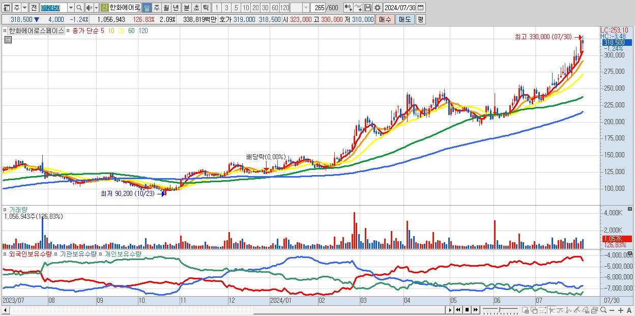 - 한화에어로스페이스 (318,500원 ▼ -1.24% , 시총: 161,257억, 거래량: 1,056,943, 거래대금:3,388억)