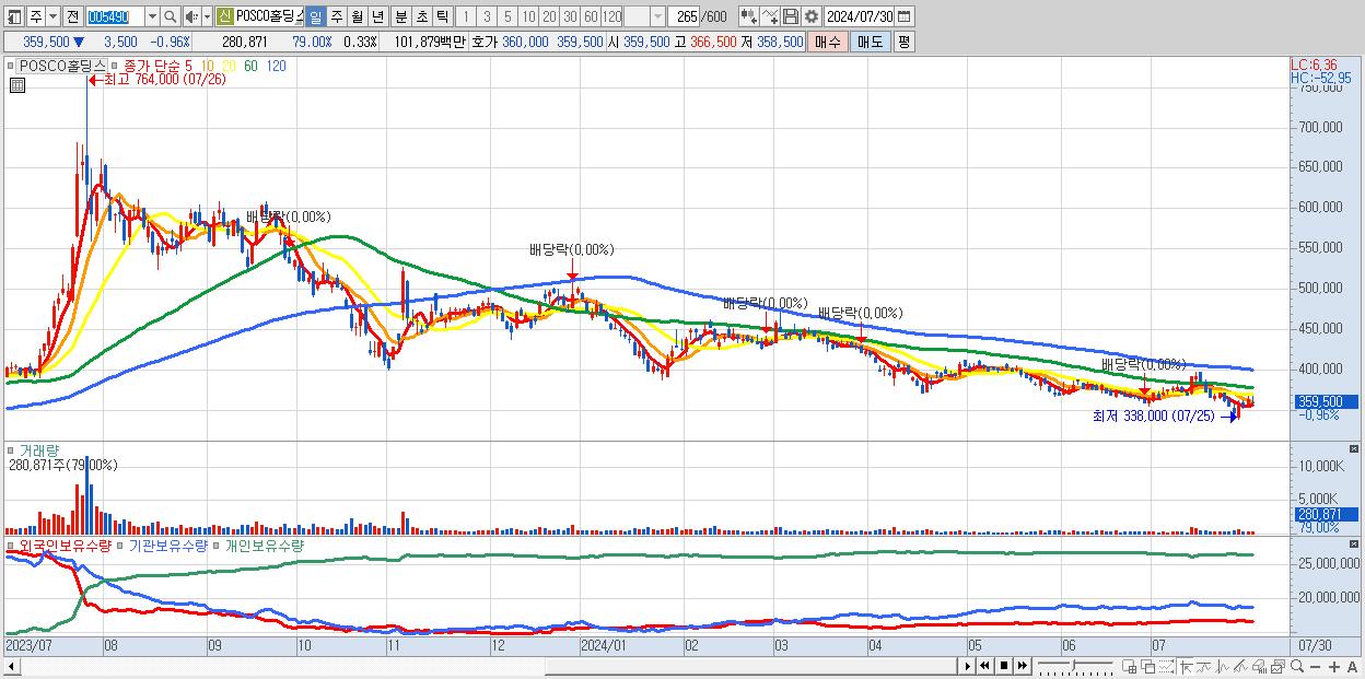 - POSCO홀딩스 (359,500원 ▼ -0.96% , 시총: 304,034억, 거래량: 280,871, 거래대금:1,019억)
