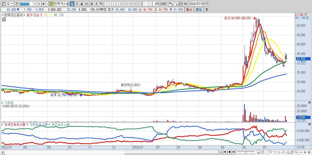 - 한국가스공사 (42,400원 ▼ -3.85% , 시총: 39,141억, 거래량: 3,689,302, 거래대금:1,593억)