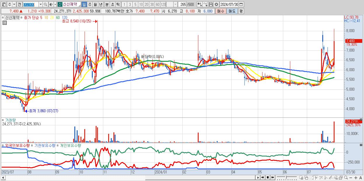 - 신신제약 (7,480원 ▲ 19.3% , 시총: 1,135억, 거래량: 24,271,371, 거래대금:1,808억)