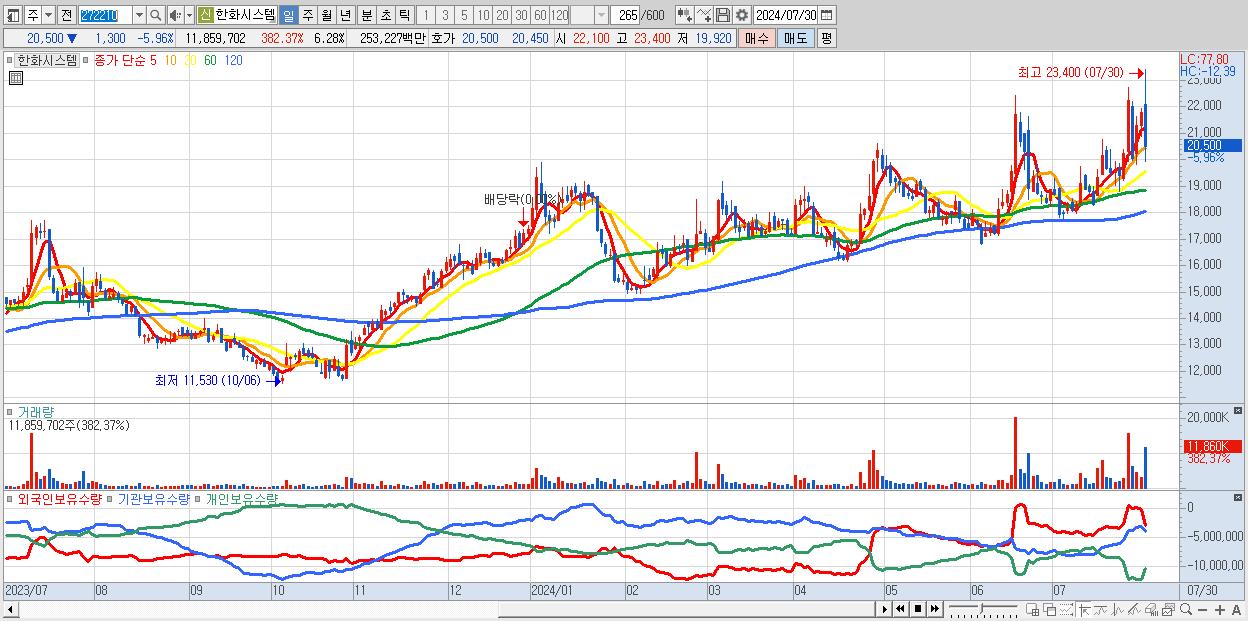 - 한화시스템 (20,500원 ▼ -5.96% , 시총: 38,728억, 거래량: 11,859,702, 거래대금:2,532억)