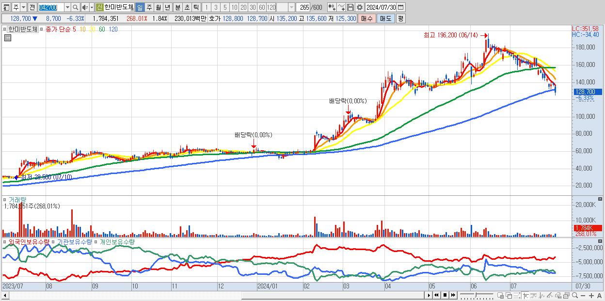 - 한미반도체 (128,700원 ▼ -6.33% , 시총: 124,831억, 거래량: 1,784,351, 거래대금:2,300억)