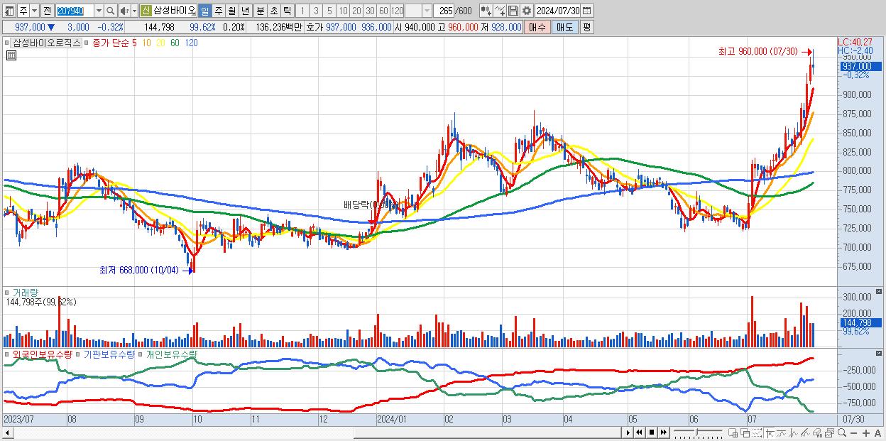 - 삼성바이오로직스 (937,000원 ▼ -0.32% , 시총: 666,900억, 거래량: 144,798, 거래대금:1,362억)