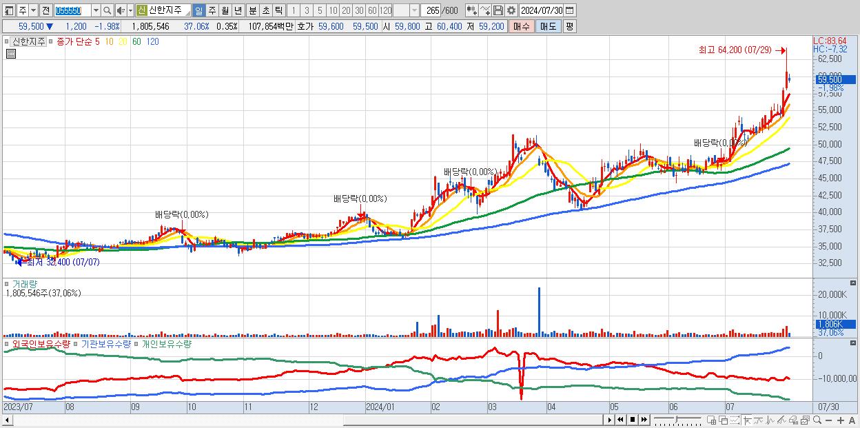 - 신한지주 (59,500원 ▼ -1.98% , 시총: 303,089억, 거래량: 1,805,546, 거래대금:1,079억)