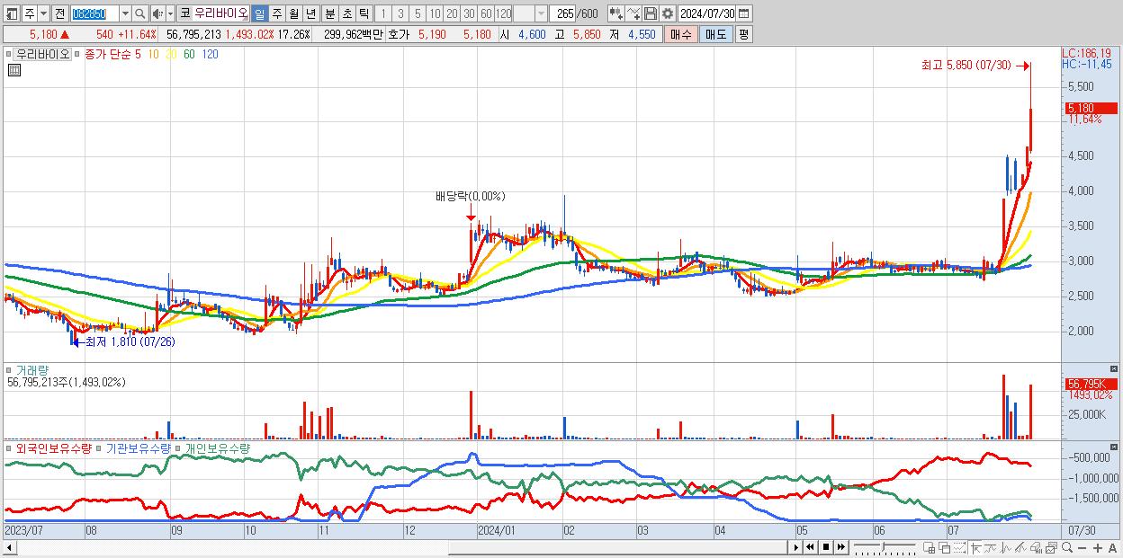 - 우리바이오 (5,180원 ▲ 11.64% , 시총: 2,509억, 거래량: 56,795,213, 거래대금:3,000억)