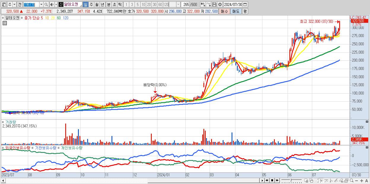 - 알테오젠 (320,500원 ▲ 7.37% , 시총: 170,341억, 거래량: 2,349,207, 거래대금:7,220억)