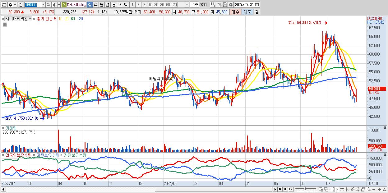 - 하나머티리얼즈 (50,300원 ▲ 8.17% , 시총: 9,948억, 거래량: 220,758, 거래대금:108억)