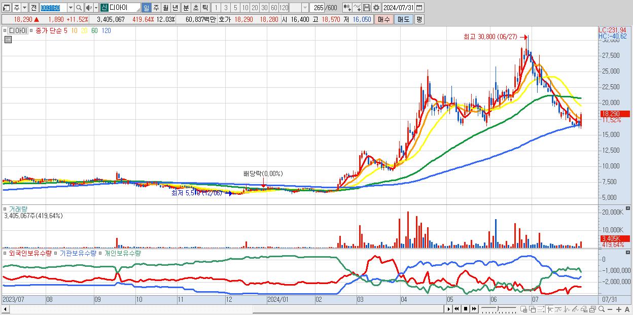 - 디아이 (18,290원 ▲ 11.52% , 시총: 5,176억, 거래량: 3,405,067, 거래대금:608억)