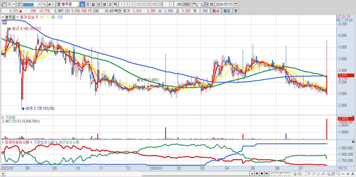 - 블루콤 (3,315원 ▲ 9.77% , 시총: 567억, 거래량: 2,947,121, 거래대금:104억)