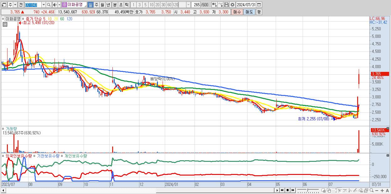 - 이화공영 (3,765원 ▲ 24.46% , 시총: 746억, 거래량: 13,540,667, 거래대금:495억)