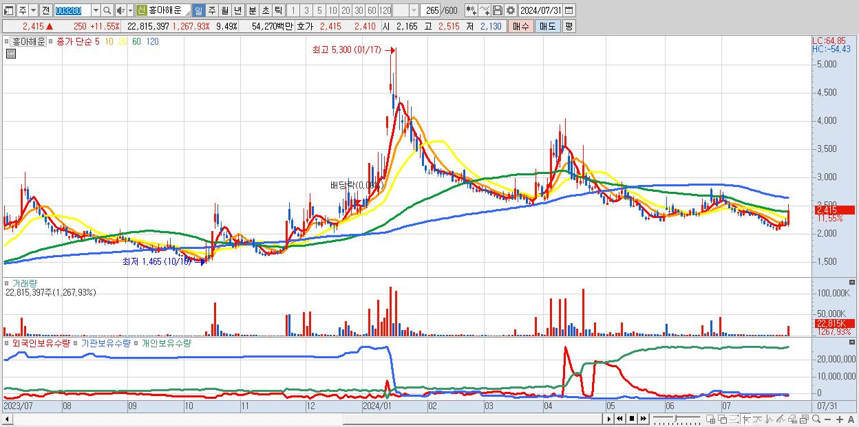 - 흥아해운 (2,415원 ▲ 11.55% , 시총: 5,806억, 거래량: 22,815,397, 거래대금:543억)