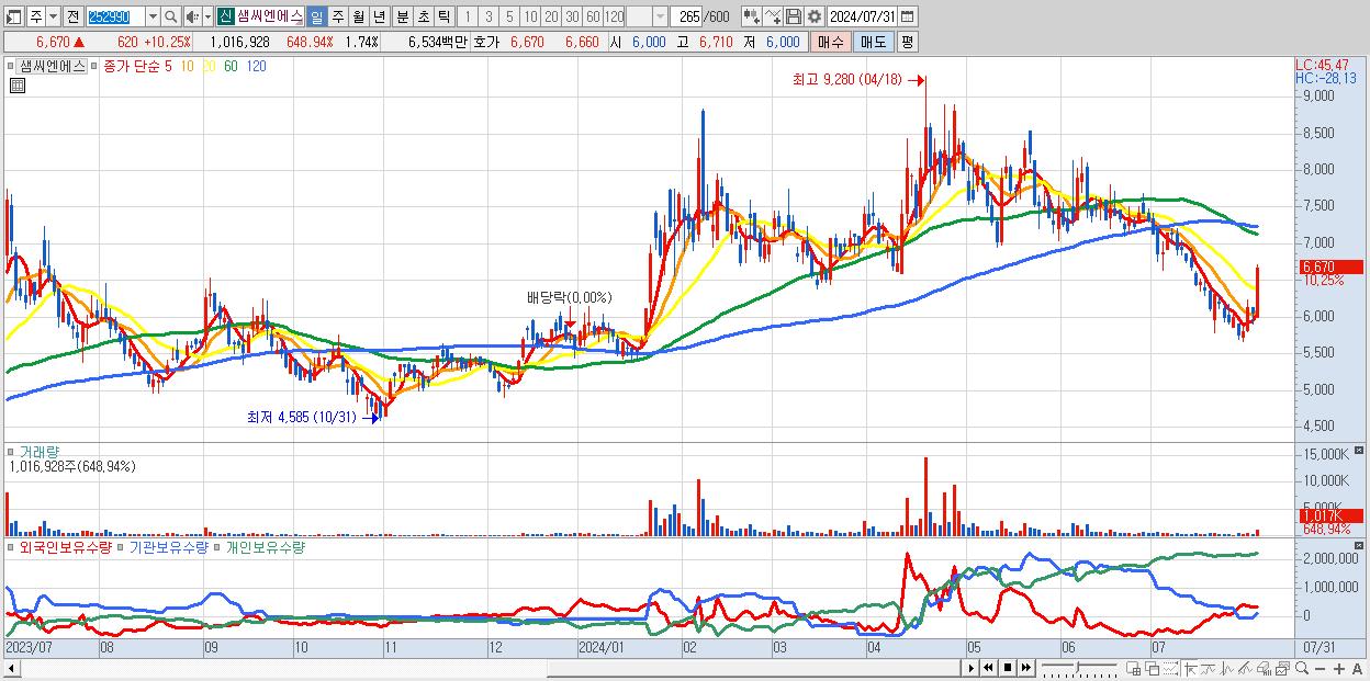- 샘씨엔에스 (6,670원 ▲ 10.25% , 시총: 3,894억, 거래량: 1,016,928, 거래대금:65억)