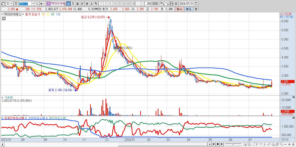 - 멕아이씨에스 (2,665원 ▲ 11.97% , 시총: 428억, 거래량: 2,003,617, 거래대금:53억)