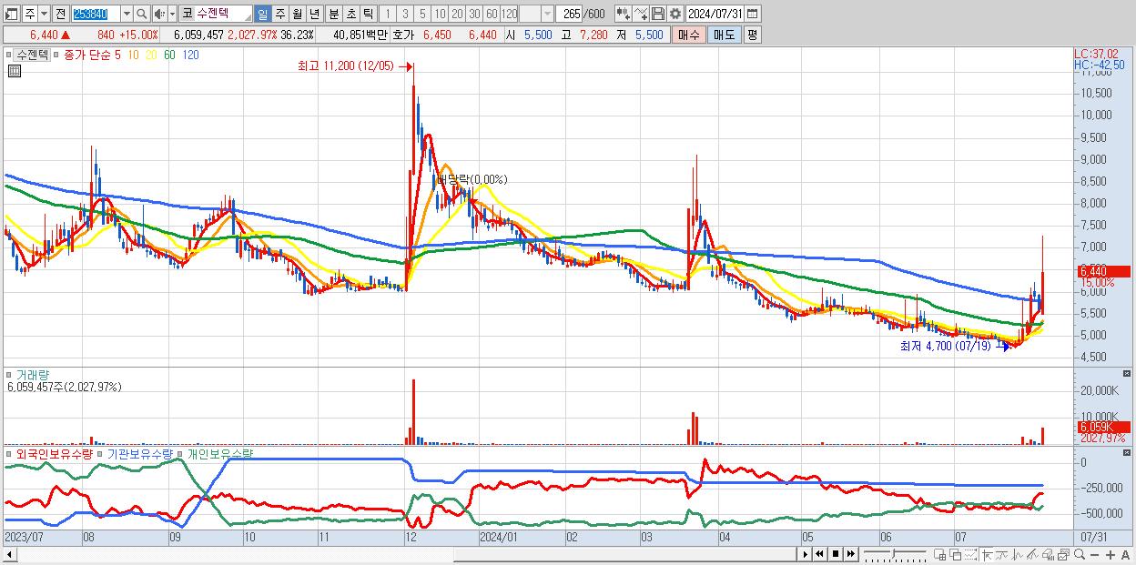 - 수젠텍 (6,440원 ▲ 15% , 시총: 1,077억, 거래량: 6,059,457, 거래대금:409억)