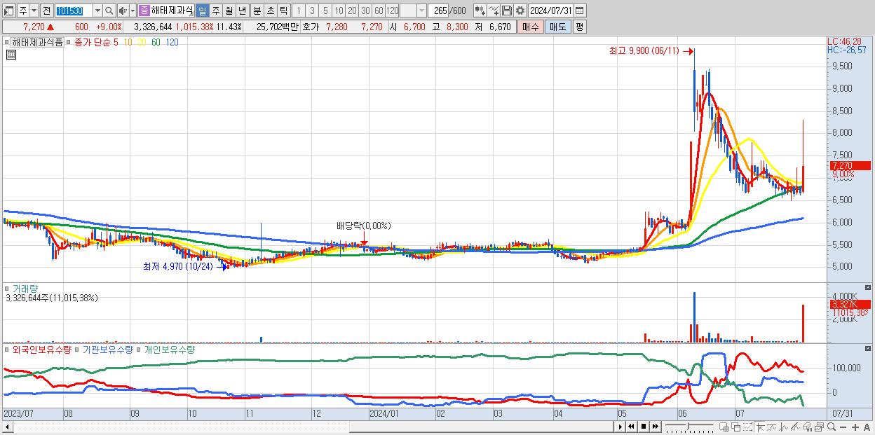 - 해태제과식품 (7,270원 ▲ 9% , 시총: 2,117억, 거래량: 3,326,644, 거래대금:257억)