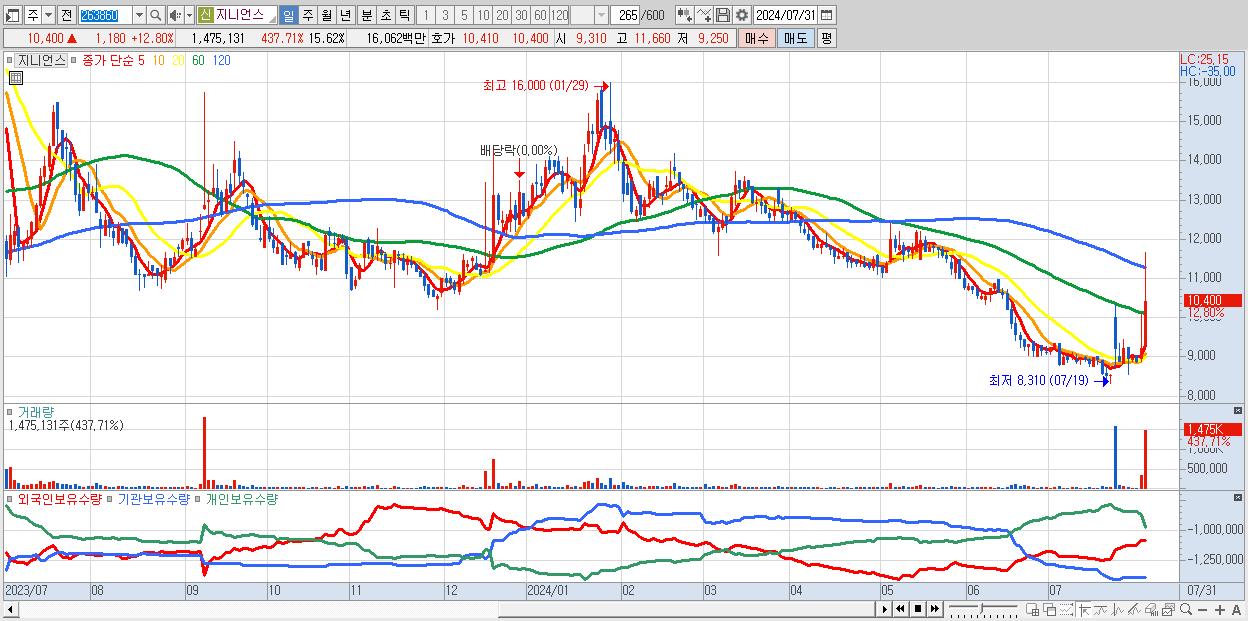 - 지니언스 (10,400원 ▲ 12.8% , 시총: 982억, 거래량: 1,475,131, 거래대금:161억)