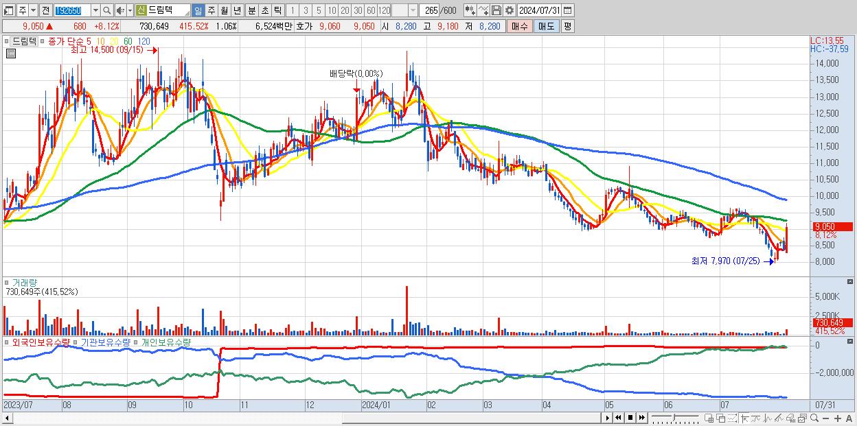 - 드림텍 (9,050원 ▲ 8.12% , 시총: 6,233억, 거래량: 730,649, 거래대금:65억)
