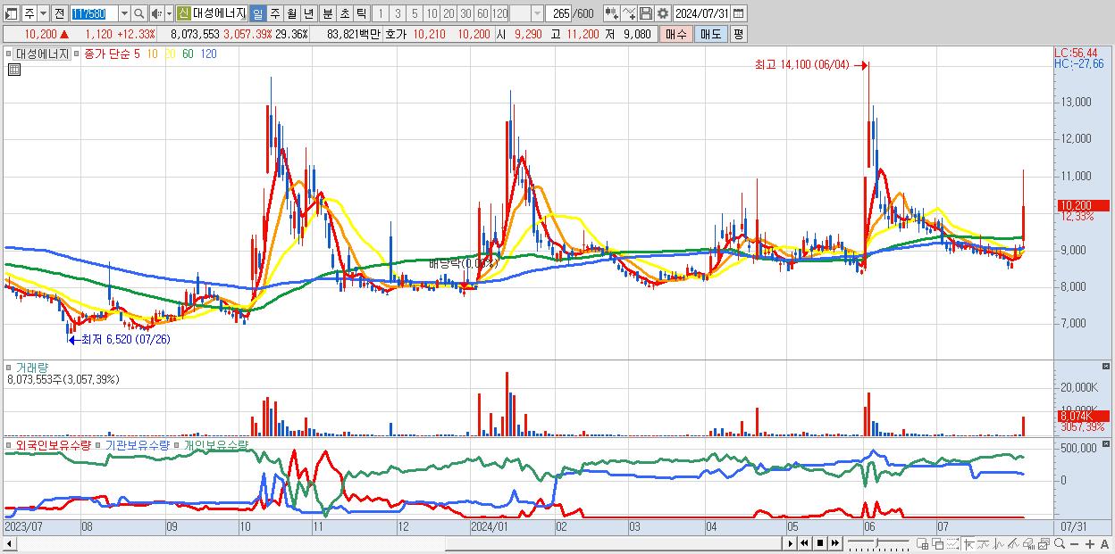 - 대성에너지 (10,200원 ▲ 12.33% , 시총: 2,805억, 거래량: 8,073,553, 거래대금:838억)