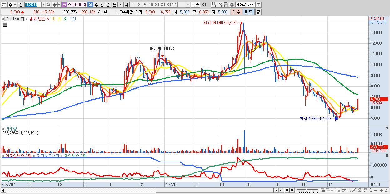 - 스피어파워 (6,780원 ▲ 15.5% , 시총: 852억, 거래량: 268,776, 거래대금:17억)