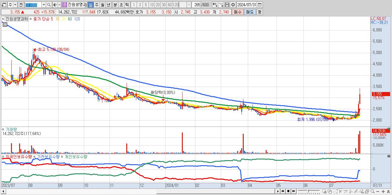 - 진원생명과학 (3,155원 ▲ 15.57% , 시총: 2,525억, 거래량: 14,262,722, 거래대금:447억)