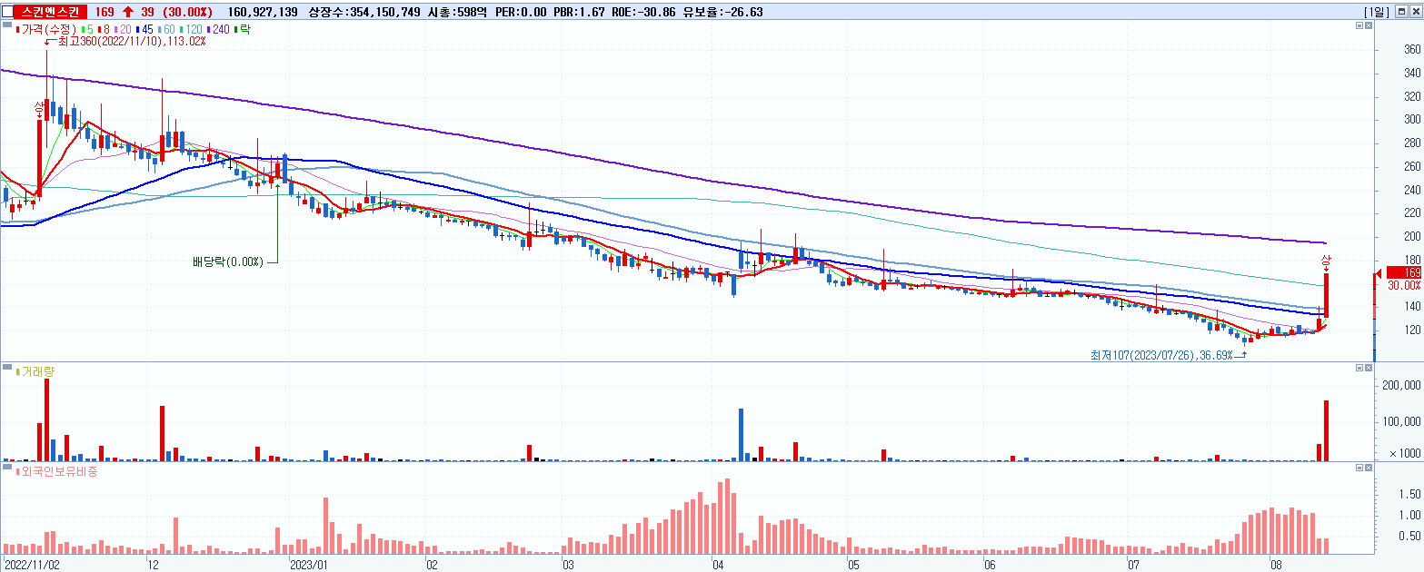 2.스킨앤스킨 169원 ▲ 30% (KOSDAQ, 159910)