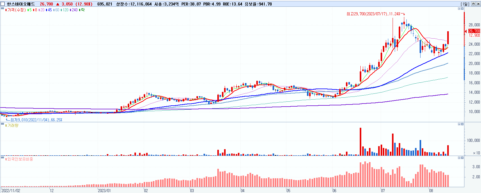 - 한스바이오메드 (12.9%, 시총: 3,235억, 거래량: 695,314, 거래대금:180억)
