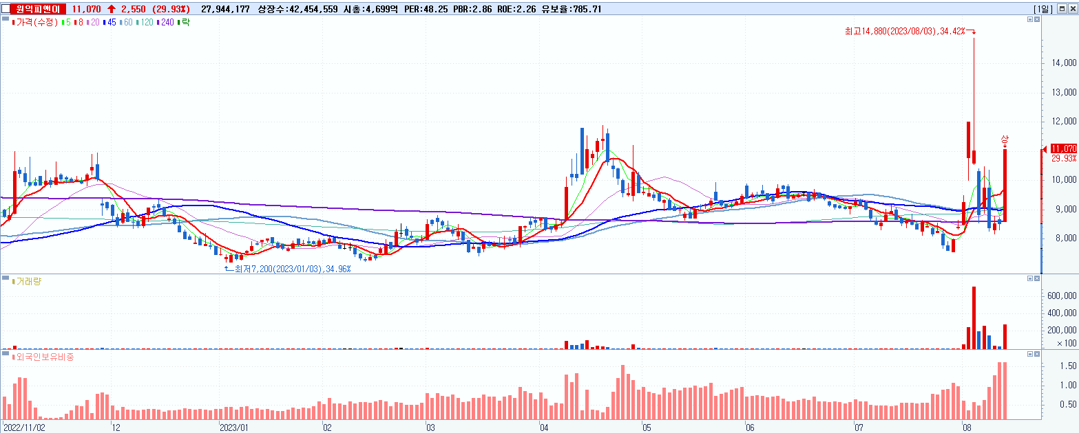 4.원익피앤이 11,070원 ▲ 29.93% (KOSDAQ, 217820)