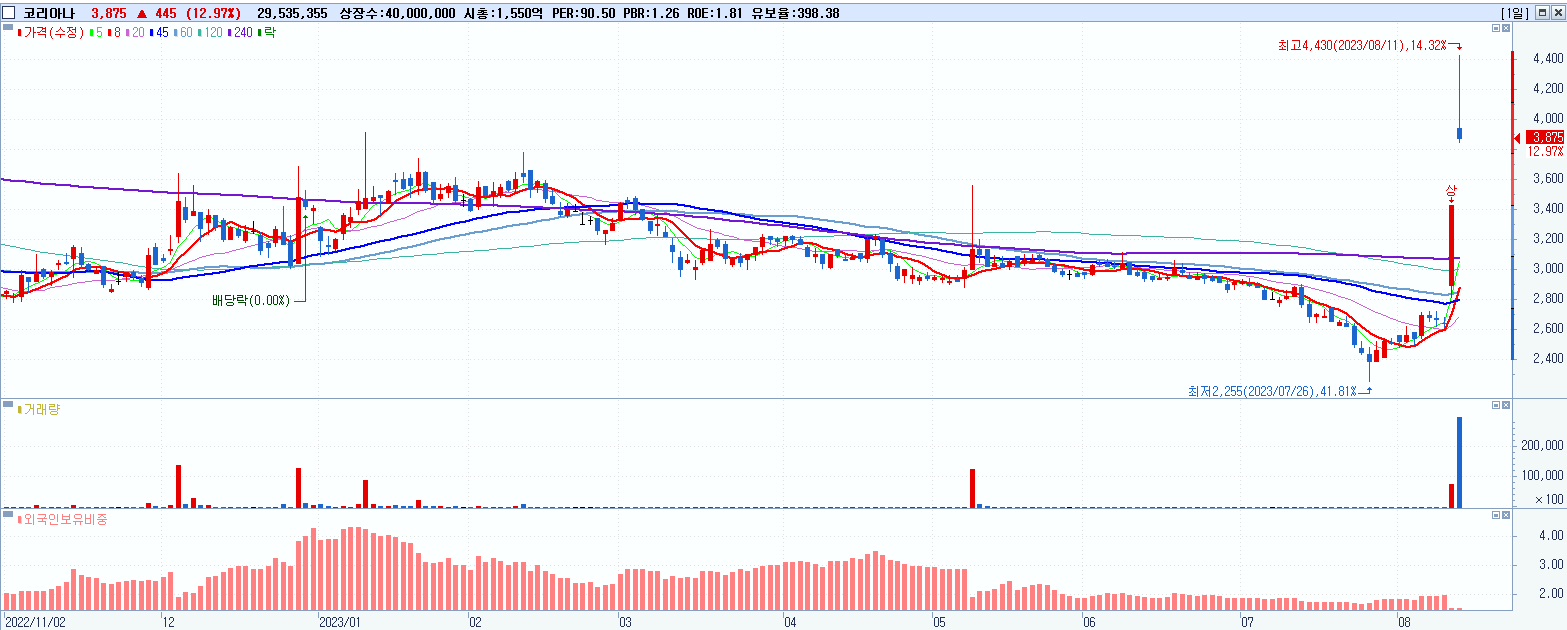 - 코리아나 (12.97%, 시총: 1,550억, 거래량: 29,545,789, 거래대금:1,219억)