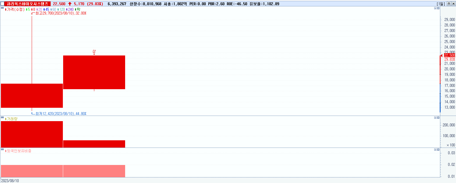 - 큐리옥스바이오시스템즈 (29.83%, 시총: 1,802억, 거래량: 6,393,309, 거래대금:1,283억)