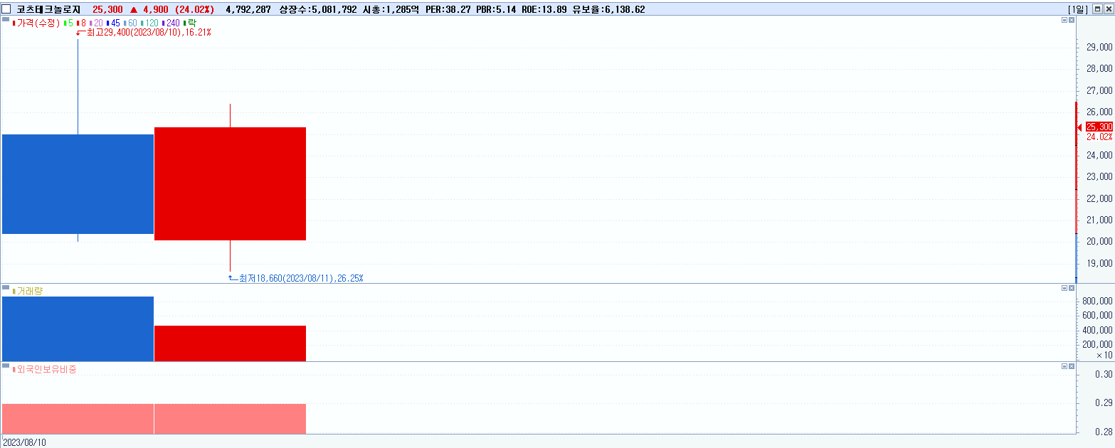- 코츠테크놀로지 (24.02%, 시총: 1,286억, 거래량: 4,795,932, 거래대금:1,174억)