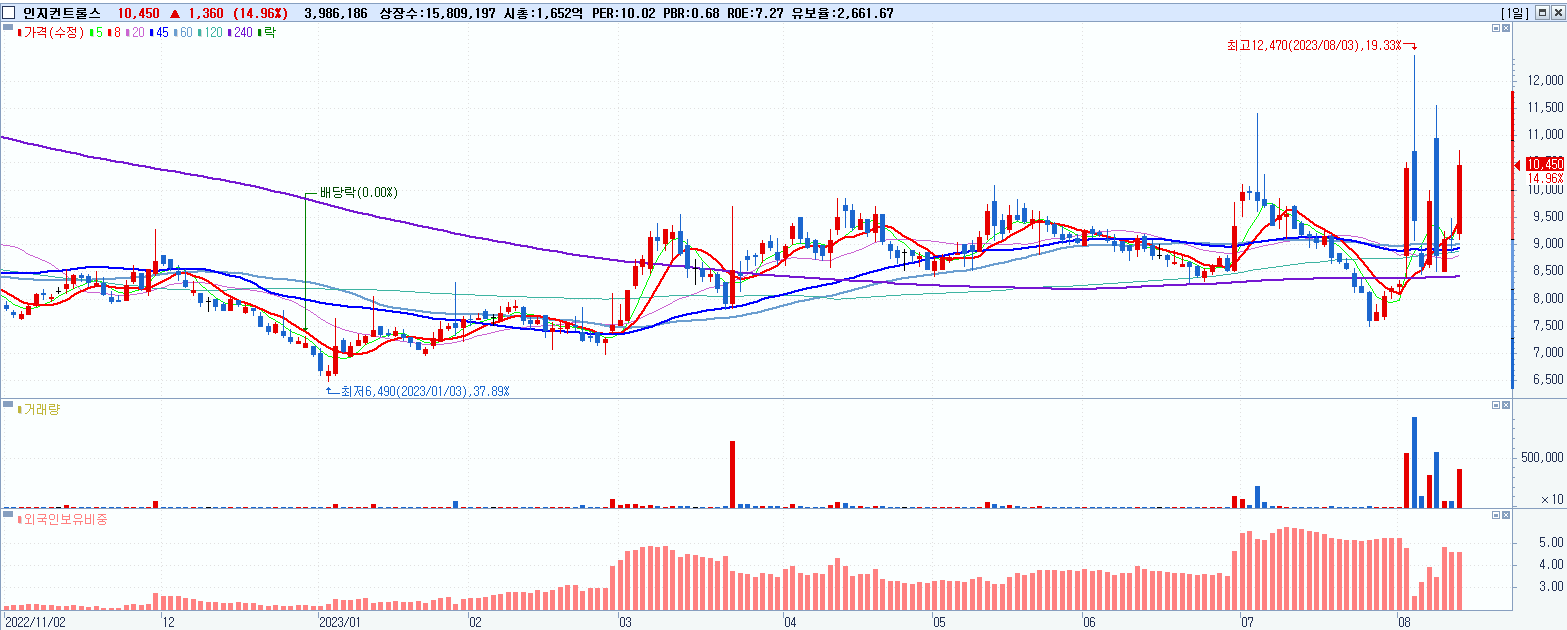 - 인지컨트롤스 (14.96%, 시총: 1,652억, 거래량: 4,084,314, 거래대금:412억)