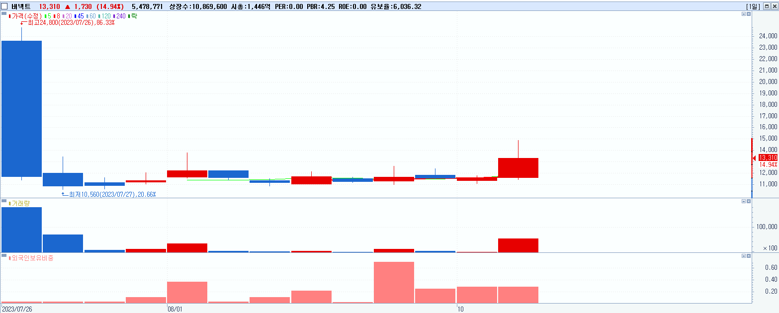 - 버넥트 (14.94%, 시총: 1,447억, 거래량: 5,487,997, 거래대금:747억)