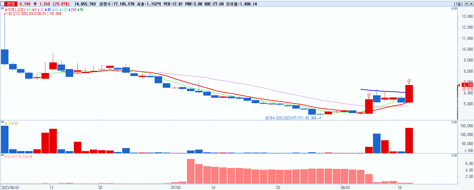 6.진영 6,740원 ▲ 29.87% (KOSDAQ, 285800)