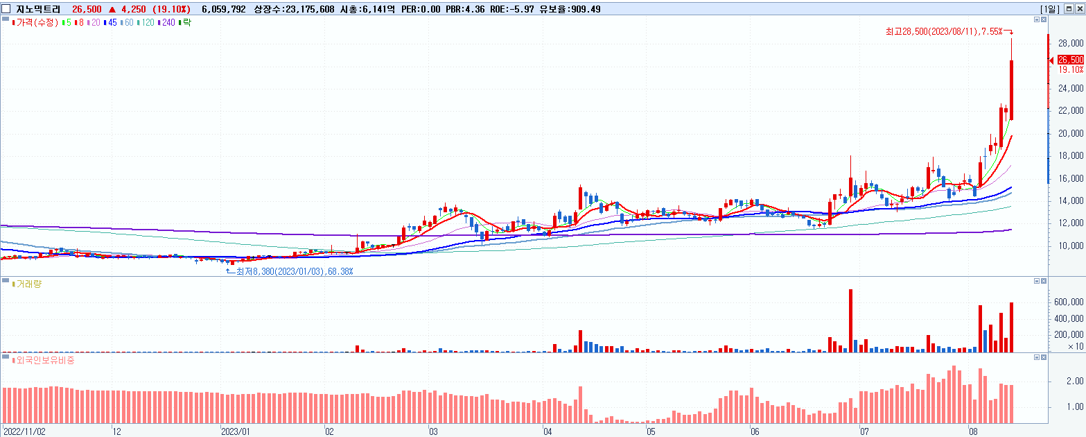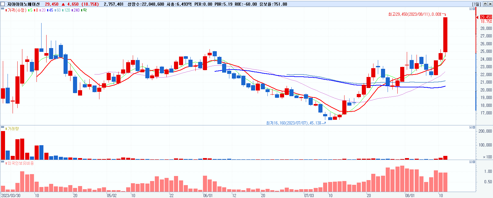 - 지아이이노베이션 (18.75%, 시총: 6,493억, 거래량: 2,764,118, 거래대금:744억)