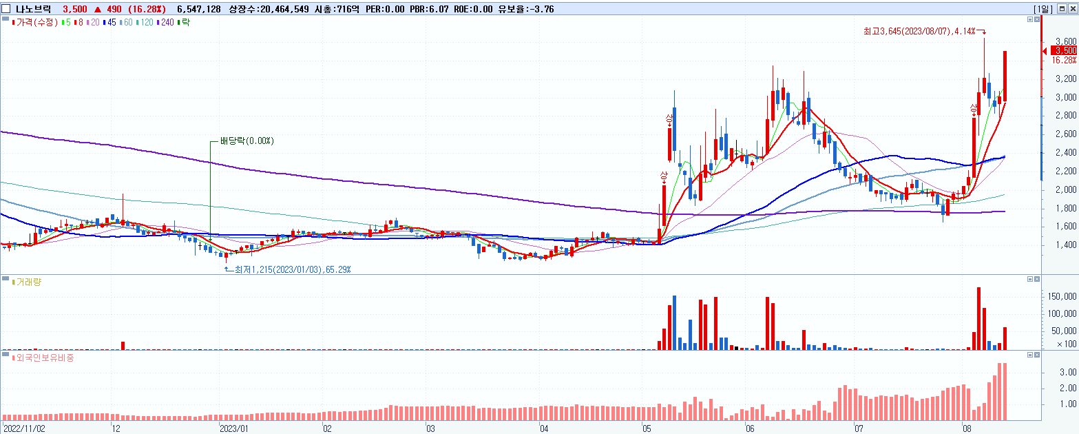 - 나노브릭 (16.28%, 시총: 716억, 거래량: 6,561,324, 거래대금:219억)